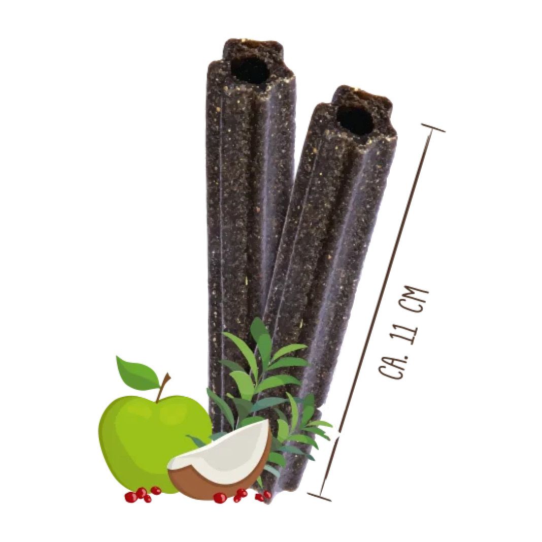 Sammy's lecker duftende Zahnriegel werden mit Aloe Vera, Eukalyptus- und Kokosöl sowie gesunden Äpfeln und Granatäpfeln verfeinert und sind durch ihre spezielle Form eine wunderbare Ergänzung zur Zahnpflege mit der Hundezahnbürste. Das Kauen der Riegel stimuliert das Zahnfleisch, Futterreste können entfernt und Zahnsteinbildung vorgebeugt werden.