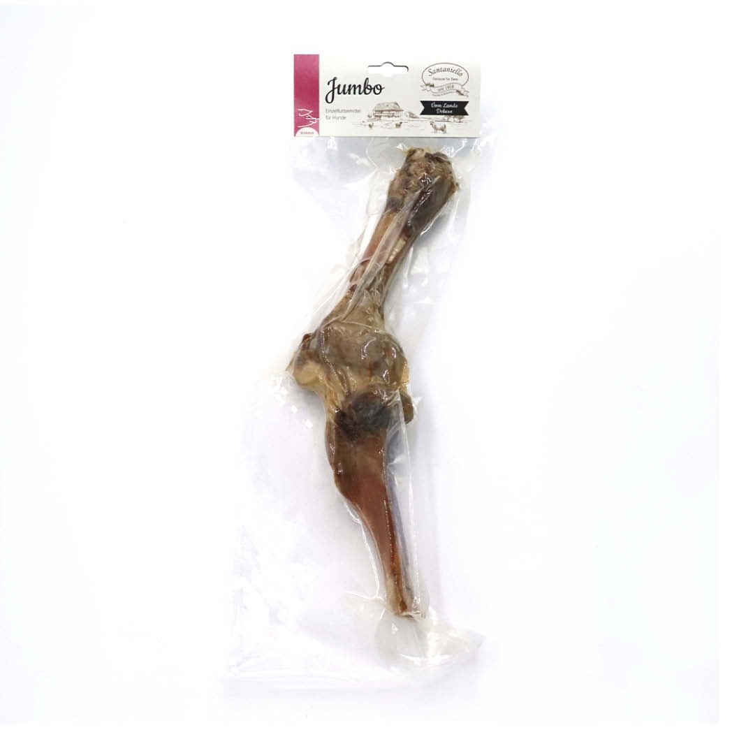 Santaniello’s Edel-Schinkenknochen Jumbo garantieren durch einen großen Fleisch- und Knorpelanteil einen langen, sehr intensiven Kaugenuss. Ideal auch zur Stressbewältigung.