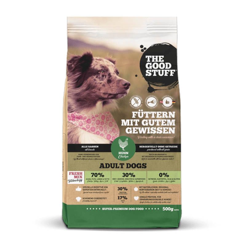 TROCKENFUTTER HUHN für ausgewachsene Hunde in bewährter THE GOODSTUFF Super Premium-Qualität. Ein ideales Alleinfuttermittel für Hunde aller Rassen und Größen mit normaler Aktivität. Schonend hergestellt ohne Getreide, reich an frischem Hühner- & Puten-Muskelfleisch in Lebensmittelqualität, Amaranth mit niedrigem glykämischen Index, regional verfügbarem Obst & Gemüse sowie ausgewählten Kräutern.