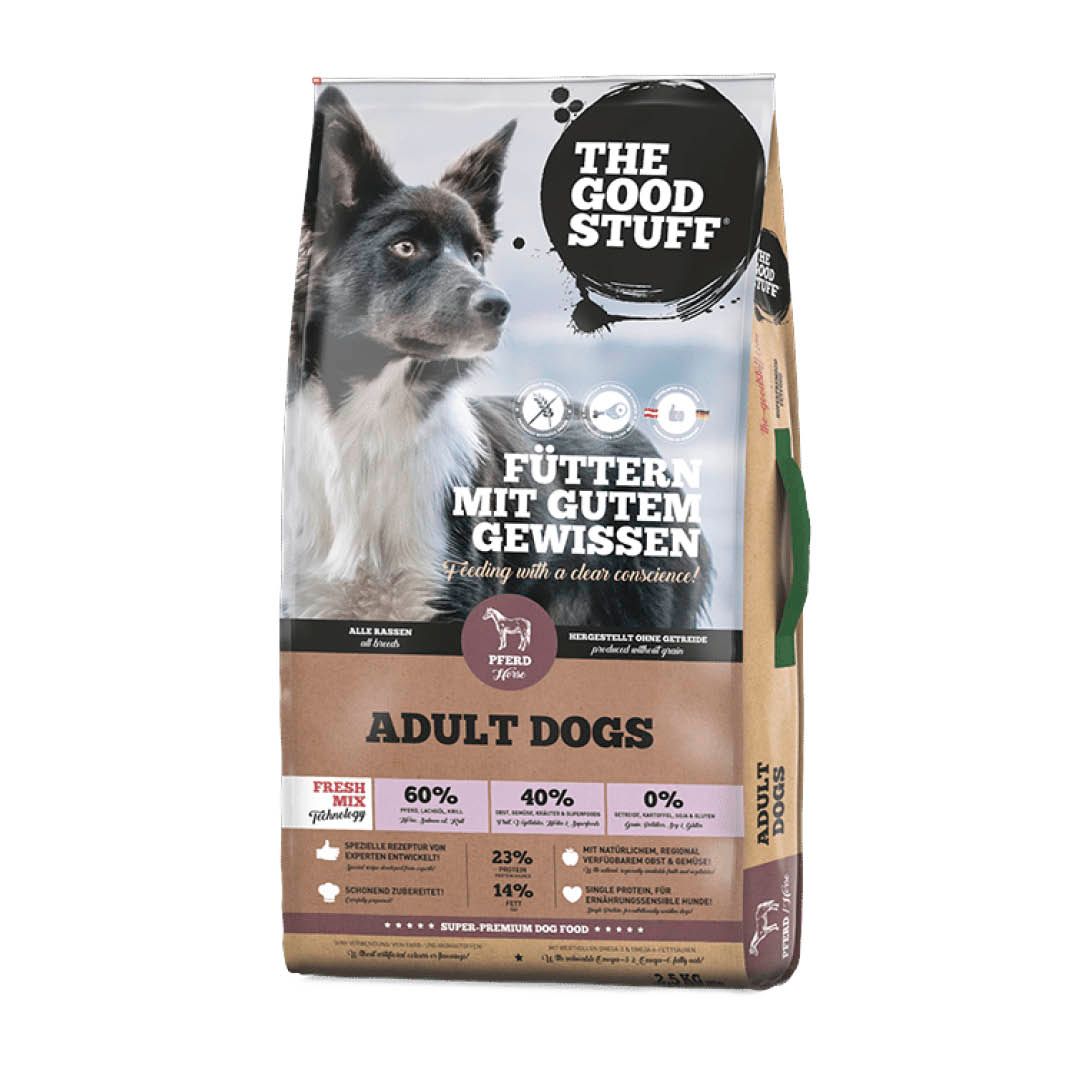 TROCKENFUTTER PFERD in bewährter THE GOODSTUFF Super Premium-Qualität ist ein Alleinfuttermittel für ausgewachsene Hunde aller Rassen und Größen. Pferdefleisch ist hypoallergen und somit auch für ernährungssensible Hunde besonders gut verträglich. Schonend hergestellt ohne Getreide, reich an frischem Pferde-Muskelfleisch, regional verfügbarem Obst & Gemüse, ausgewählten Kräutern sowie hochwertigen Omega-6 und Omega-3 Fettsäuren aus natürlichen Quellen wie Krill und Distelöl.