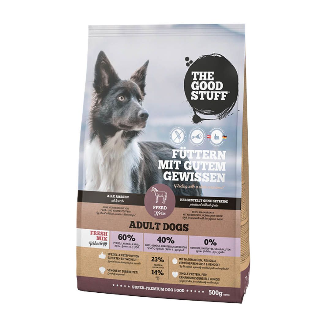 TROCKENFUTTER PFERD in bewährter THE GOODSTUFF Super Premium-Qualität ist ein Alleinfuttermittel für ausgewachsene Hunde aller Rassen und Größen. Pferdefleisch ist hypoallergen und somit auch für ernährungssensible Hunde besonders gut verträglich. Schonend hergestellt ohne Getreide, reich an frischem Pferde-Muskelfleisch, regional verfügbarem Obst & Gemüse, ausgewählten Kräutern sowie hochwertigen Omega-6 und Omega-3 Fettsäuren aus natürlichen Quellen wie Krill und Distelöl.