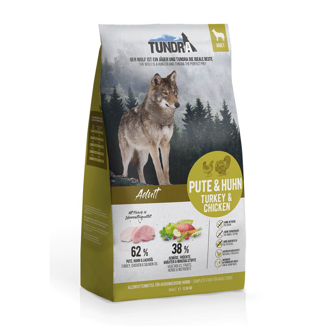Nachdem wir uns intensiv mit der ursprünglichen Ernährung des Urvaters unserer Haushunde, dem Wolf, beschäftigt haben, wurde uns klar, dass wir gravierende Verbesserungen bei den Inhaltsstoffen benötigen. Unser Haushund gehört wie der Wolf zur Ordnung der Karnivoren, die sich hauptsächlich von Fleisch ernähren und unter anderem beim Verzehren Ihrer Beutetiere Obst, Gemüse, Kräuter und Kohlehydrate in Form des Mageninhalts aufnehmen. Unser Haushund ist mit dem Verdauungstrakt eines Wolfes ausgestattet und erwartet eine angemessene Ernährung. Unsere Tundra-Produktlinie ist ernährungsphysiologisch ausgewogen und getreidefrei hergestellt. Nur die besten Inhaltsstoffe, sehr viel frisches Fleisch und Fisch in Lebensmittelqualität, sowie Obst und Gemüse werden durch unser schonendes Herstellungsverfahren zu einer artgerechten Ernährung. Diese Kombination ist genau das, was unsere Lieblinge heute brauchen.