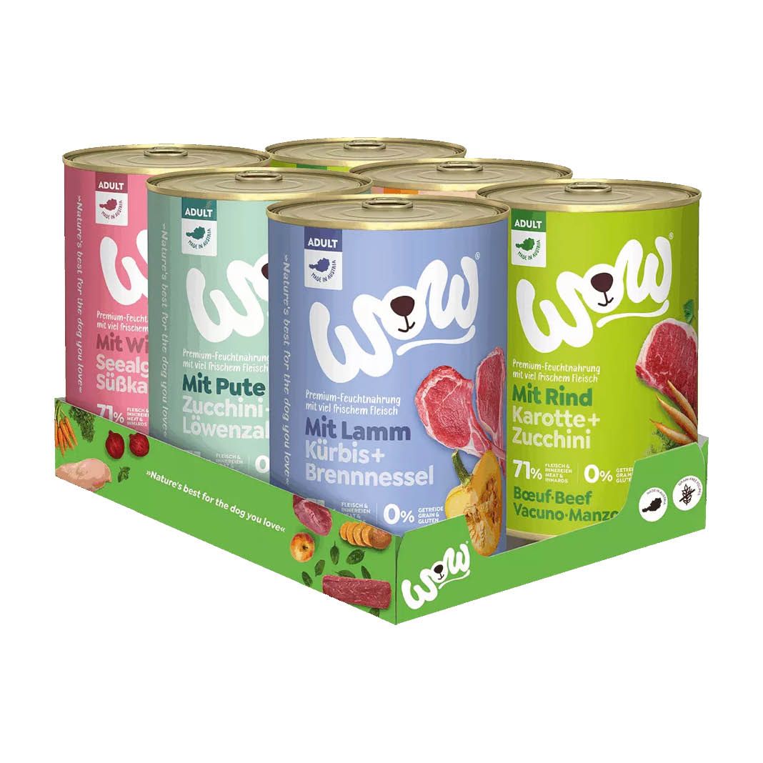 - 5x Sorten: 2x Rind, 1x Lamm, 1x Pute, 1x Lachs, 1x Wild