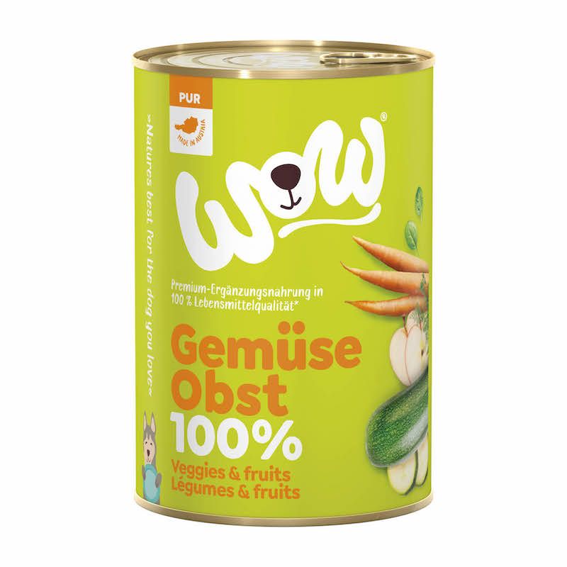 100 % Gemüse & Obst ist die Ergänzungsnahrung für alle WOW Sorten und B.A.R.F.-Ernährung mit frischem Fleisch. Für Hunde aller Größen und Rassen geeignet.