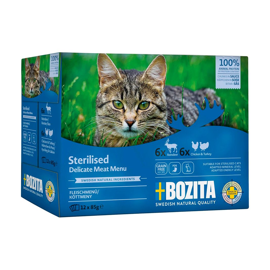 Bozita Indoor & Sterilised Fleischmenü in Soße ist ein ausgewogenes Alleinfuttermittel für die erwachsene Katze. Das Futter ist auf den etwas geringeren Energiebedarf von Wohnungs- und sterilisierten Katzen abgestimmt und somit auch für ältere und übergewichtige Katzen geeignet. Es enthält L-Carnitin, das ein wesentlicher Bestandteil des Stoffwechsels der Katze ist.