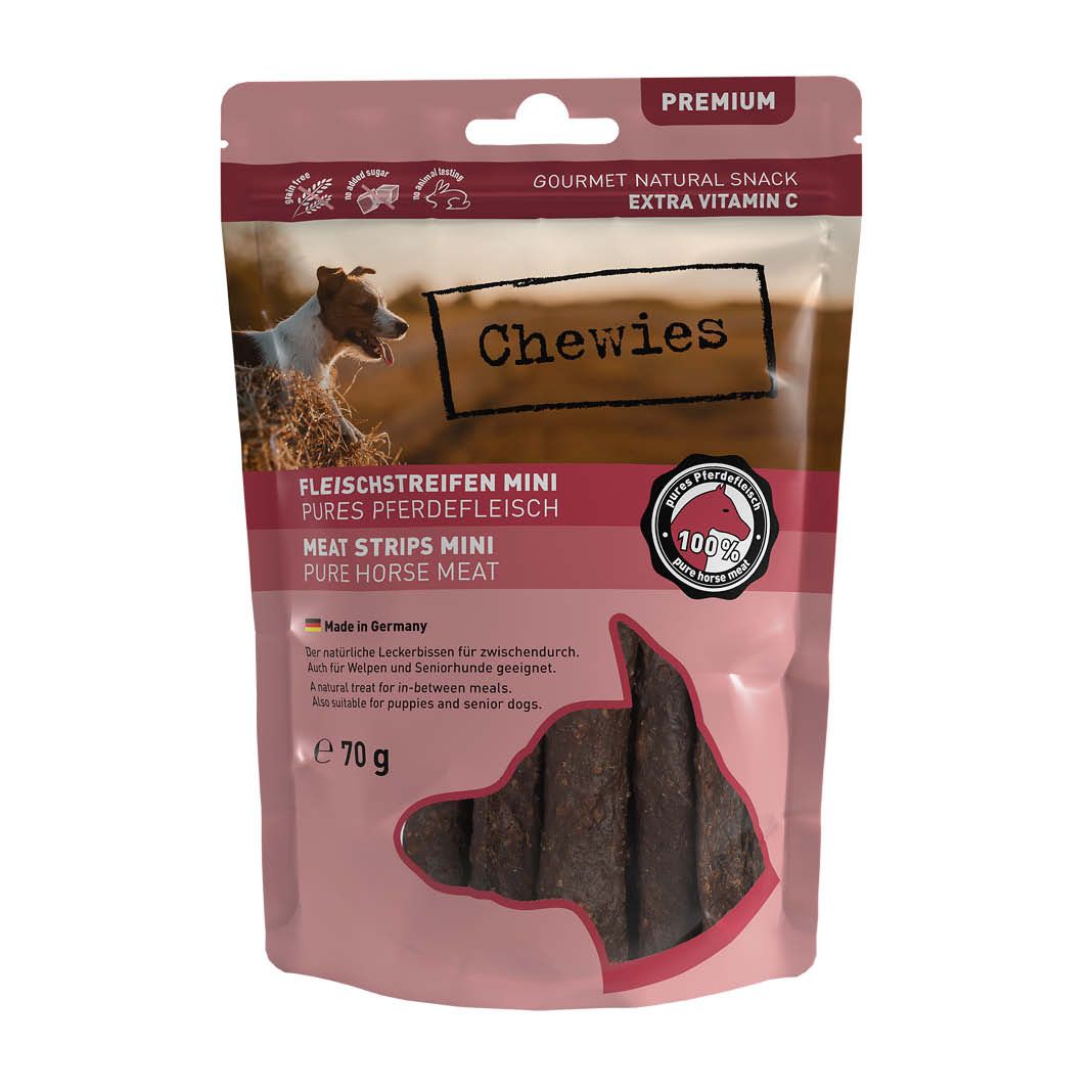 Als beliebter Snack für zwischendurch zaubern sie deiner Fellnase Zufriedenheit ins Gesicht. Von unseren Chewies Fleischstreifen gibt es zehn leckere Sorten in zwei Größen, MINI und MAXI, damit wirklich jeder Hund in den Genuss kommen kann. Welpen und die grauen Schnauzen lieben den aromatischen Fleischsnack ebenso, denn er kann ganz einfach in kleinere Stücke zerteilt werden.