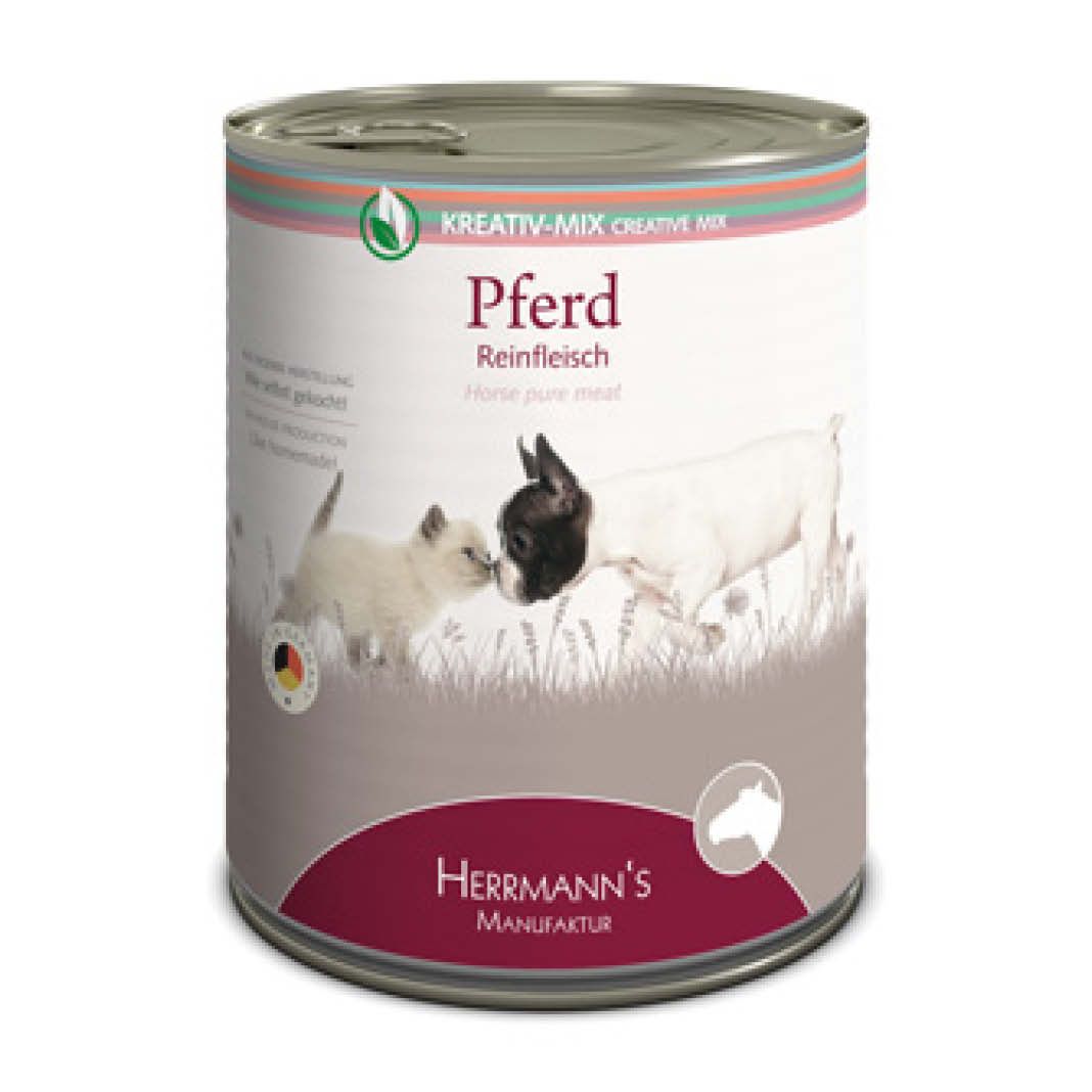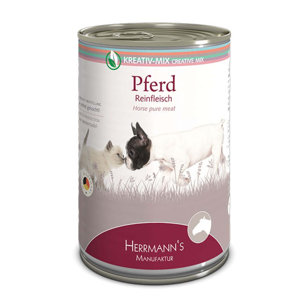 100 % Pferd (65 % Muskelfleisch, 25 % Herz, 10 % Lunge), im eigenen Saft gegart