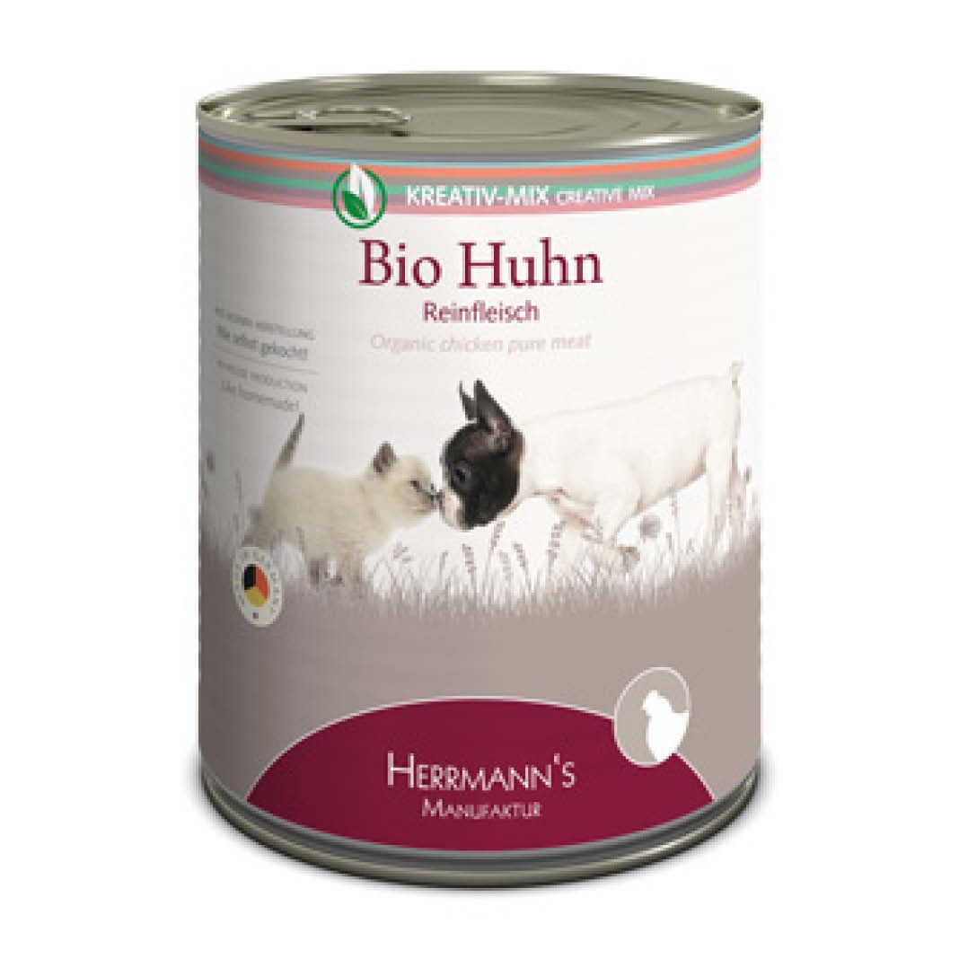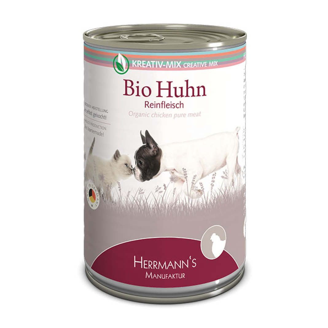 100 % Bio-Huhn (90 % Brustfleisch, 5 % Hälse, 5 % Karkasse), im eigenen Saft gegart