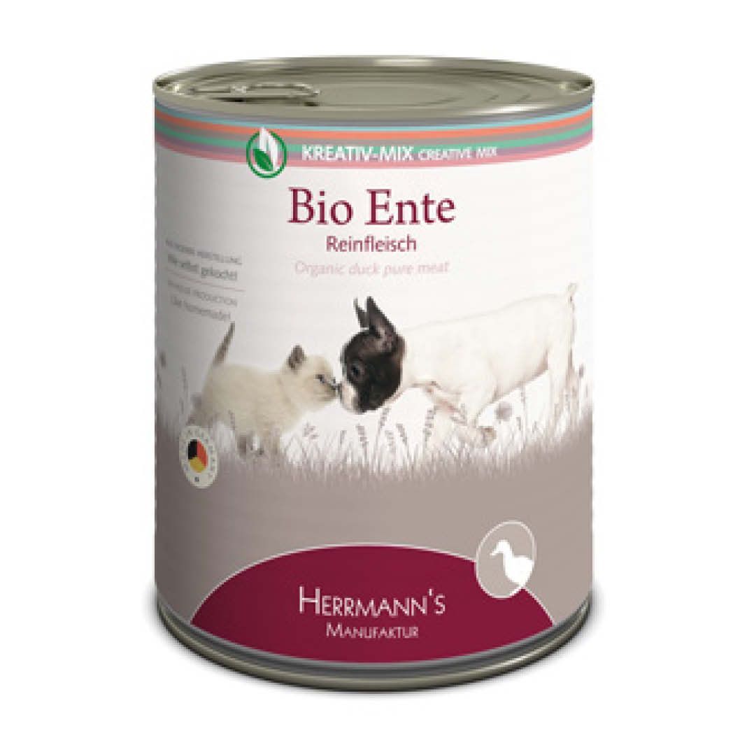 100 % Bio-Ente (90 % Brustfleisch, 5 % Hälse, 5 % Karkasse), im eigenen Saft gegart