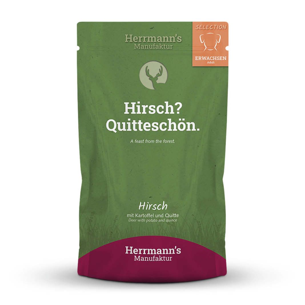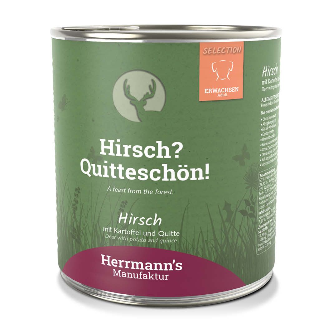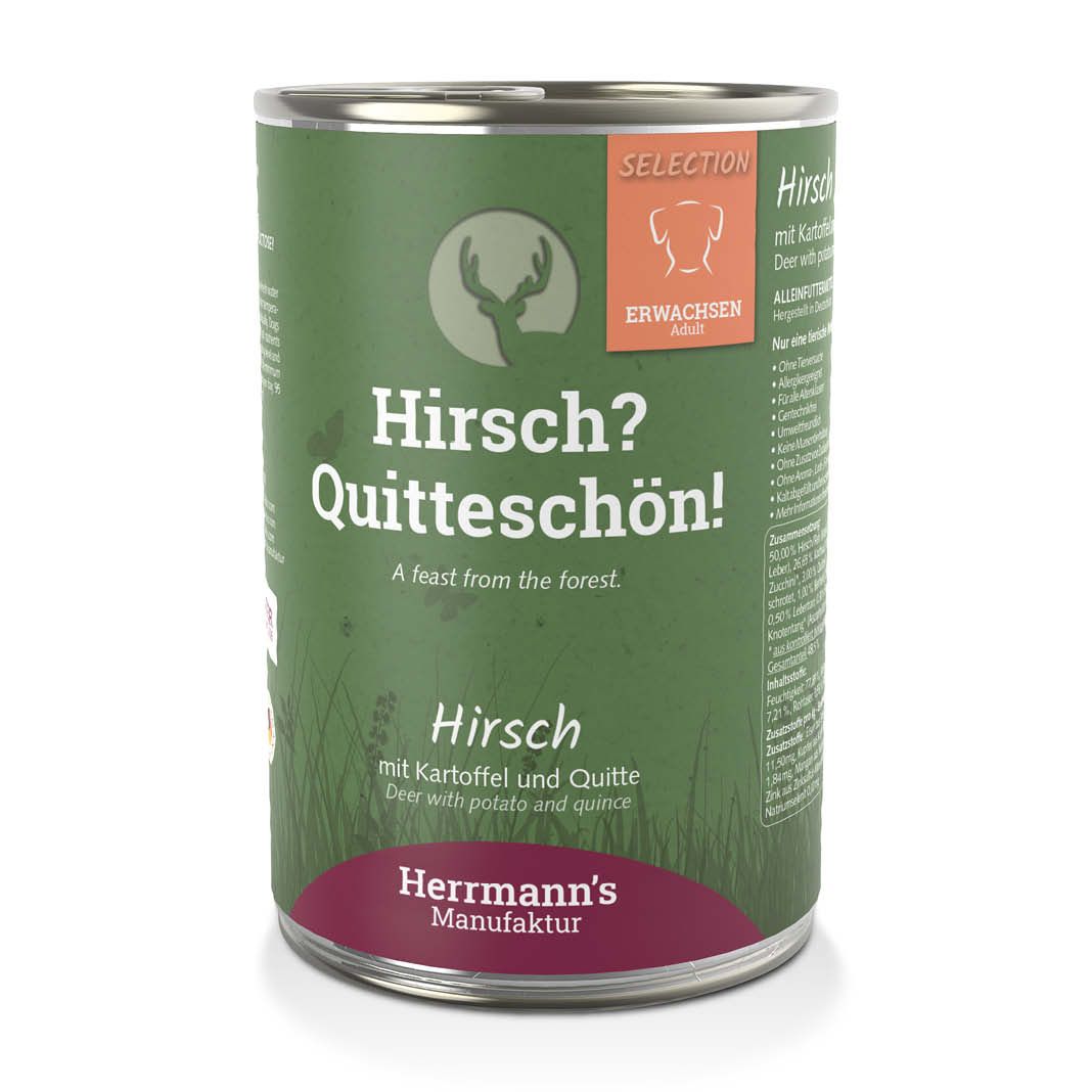 50 % Hirsch/Reh (Muskelfleisch, Herz, Lunge, Leber), 26,65 % Kochsud*, 8 % Kartoffel*, 8 % Zucchini*, 3 % Quitten*, 2 % Leinsamen* geschrotet, 1 % Bierhefe, 0,5 % Sonnenblumenöl*, 0,5 % Lebertran, 0,3 % Eierschalenpulver*, 0,05 % Knotentang* (Ascophyllum nodosum) * aus kontrolliert biologischer Erzeugung, davon Gesamtanteil 48,5 %