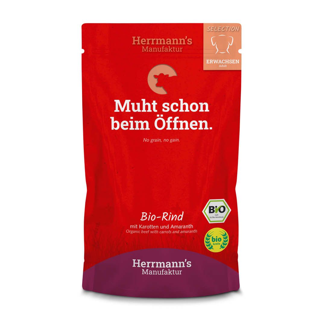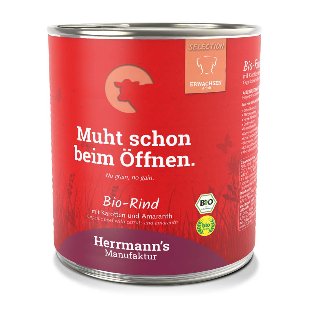 50 % Rind* (Muskelfleisch, Herz, Lunge, Leber), 27,2 % Kochsud*, 7 % Karotte*, 7 % Amaranth*, 5 % Sellerie*, 1 % Bierhefe, 1 % Früchte* (Beeren-Mix), 1 % Nachtkerzenöl*, 0,4 % Eierschalenpulver*, 0,3 % Lebertran, 0,1 % Knotentang* (Ascophyllum nodosum) * aus kontrolliert biologischer Erzeugung