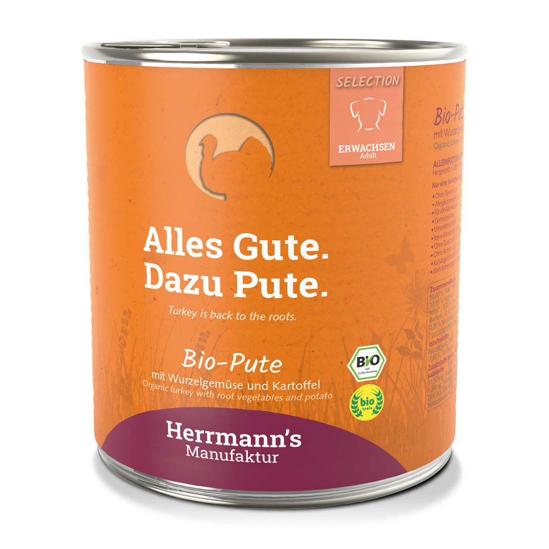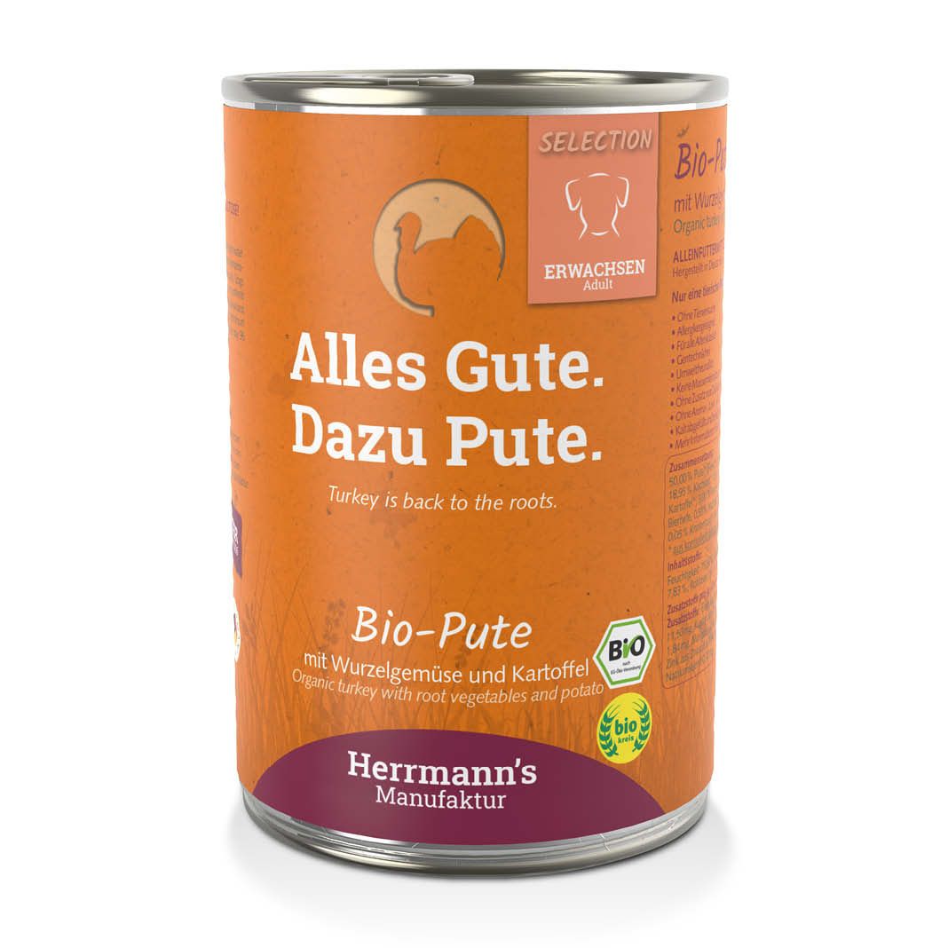 50 % Pute* (Fleisch, Karkasse, Herz, Hals, Leber), 18,95 % Kochsud*, 15 % Pastinake*, 10 % Kartoffel*, 3 % Fenchel*, 1 % Zucchini*, 1 % Bierhefe, 0,5 % Nachtkerzenöl*, 0,5 % Lebertran, 0,05 % Knotentang* (Ascophyllum nodosum) * aus kontrolliert biologischer Erzeugung