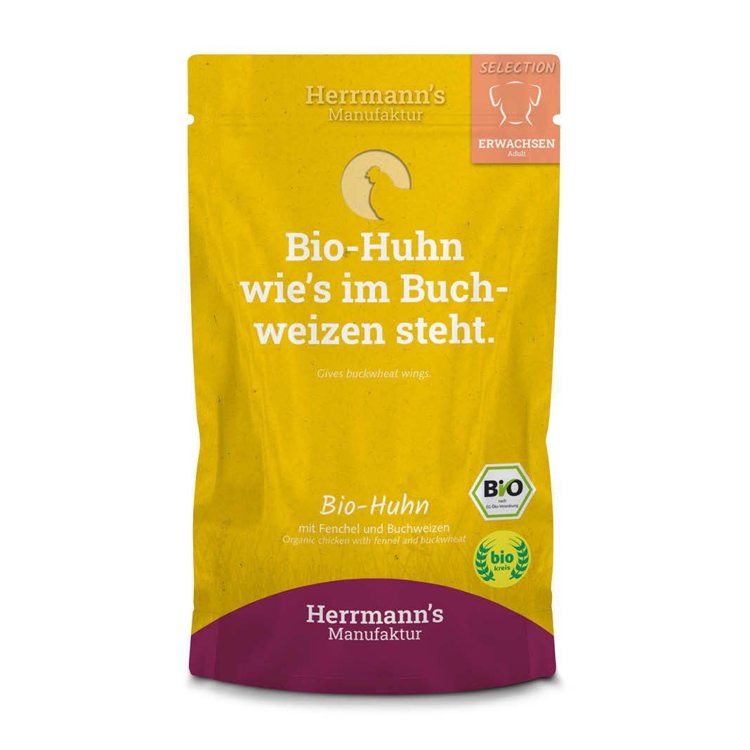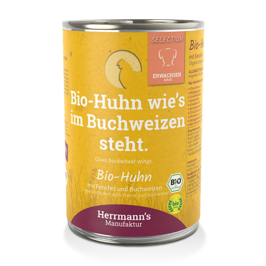 50 % Huhn* (Fleisch, Karkasse, Herz, Hals, Leber), 24,4 % Kochsud*, 8 % Zucchini*, 8 % Fenchel*, 6 % Buchweizen*, 1 % Kokosflocken*, 1 % Bierhefe, 1 % Nachtkerzenöl*, 0,5 % Lebertran, 0,1 % Knotentang* (Ascophyllum nodosum) * aus kontrolliert biologischer Erzeugung