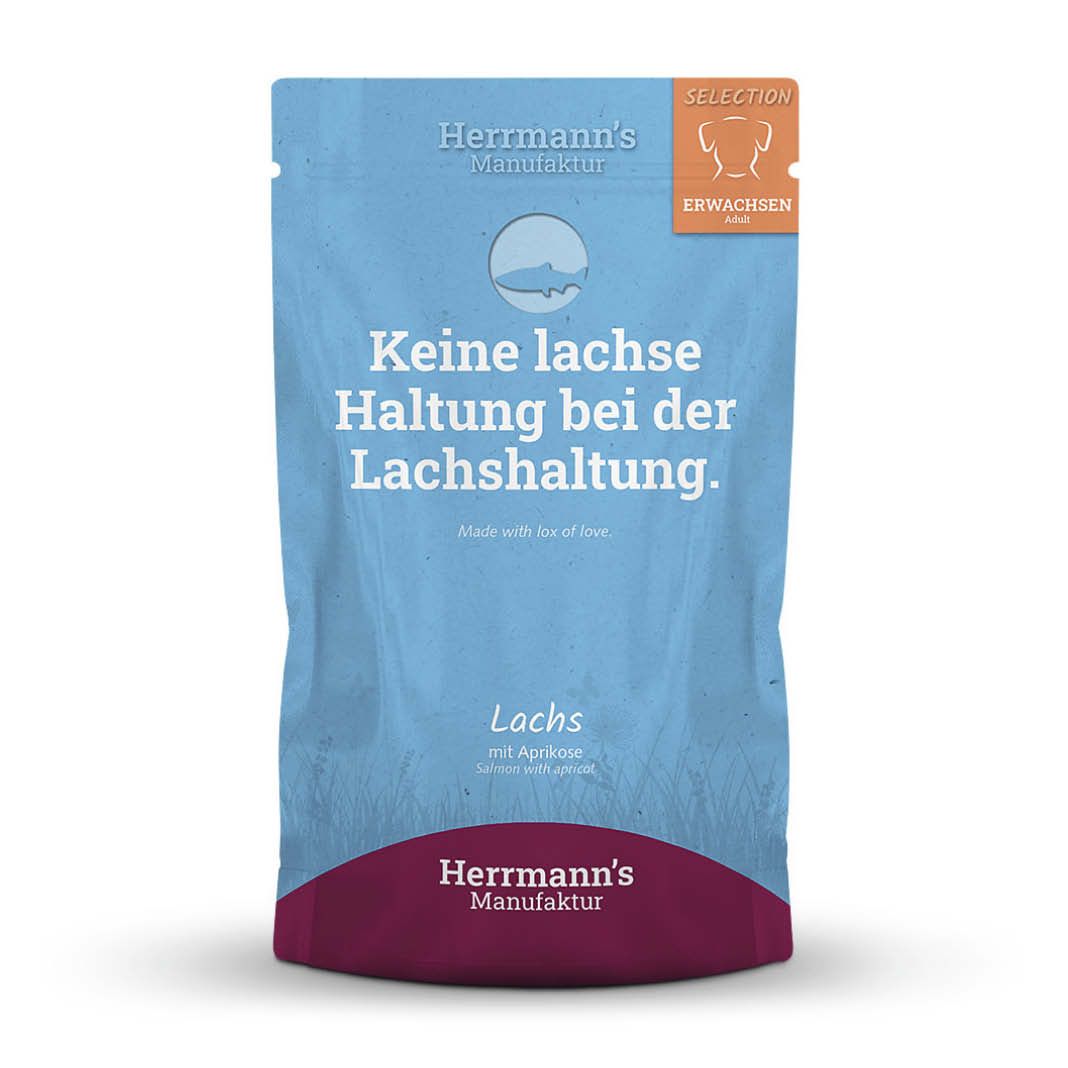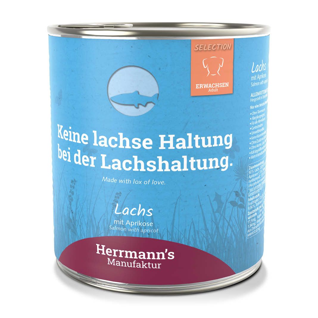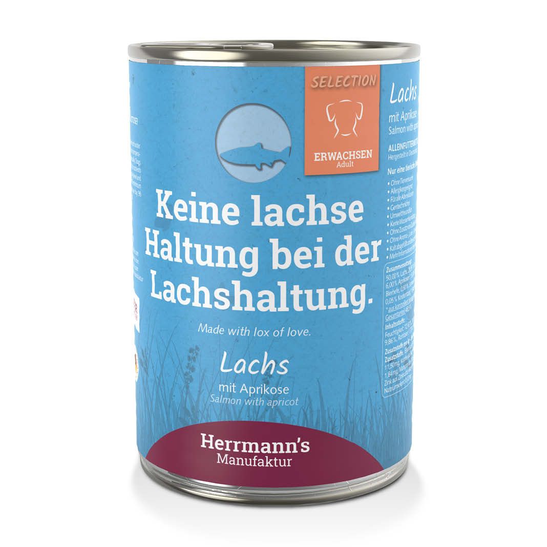 50 % Lachs, 28,95 % Kochsud*, 8 % Kartoffel*, 6 % Aprikosen*, 5 % Chiamehl*, 1 % Bierhefe, 0,5 % Sonnenblumenöl*, 0,5 % Lebertran, 0,05 % Knotentang* (Ascophyllum nodosum) * aus kontrolliert biologischer Erzeugung, davon Gesamtanteil 48,5 %