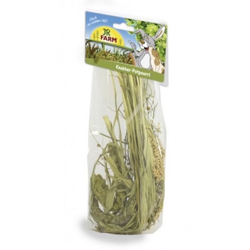 JR FARM Knabber-Potpourri besteht aus verschiednen Hirsen und Wildgräsern, wie sie auch in freier Natur zu finden sind. Die abwechslungsreiche Mischung aus Flachs, Zierkolbenhirse, Kanariensaat und Rispenhirse sorgt für die maximale Langzeitmotivation.