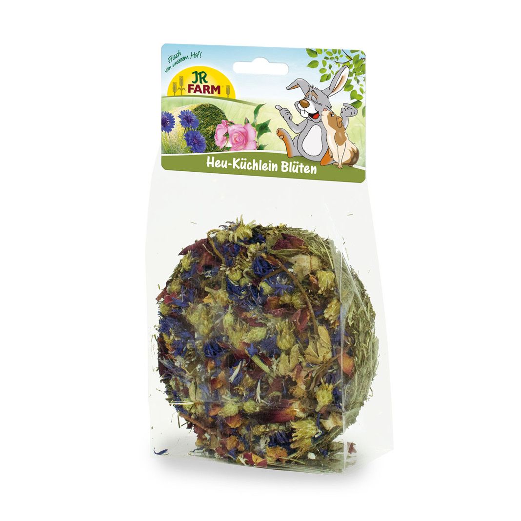 Das getreidefreie Heu-Küchlein bringt willkommene Abwechslung ins Nagerheim und ist für alle herbivoren Heimtiere ein Schmaus und eine Augenweide zugleich! Seine Basis besteht aus duftenden, getrockneten Kräutern und Heu aus eigenem Anbau. Verziert wird das Küchlein mit aromatischer Kornblume und Rose. Aus 100 % Naturmaterial gefertigt sind die Heu-Küchlein voll verzehrbar. Kornblume und Rose dienen nicht nur als attraktiver Belag, sie wirken blutreinigend, harntreibend, entzündungshemmend und beruhigend auf die Verdauungsorgane. Schonend getrocknetes Bergwiesenheu ist die Basis für eine gesunde Ernährung von allen herbivoren Kleintieren. Der hohe Rohfaseranteil fördert außerdem den wichtigen Zahnabrieb bei Nagern und Zwergkaninchen. Das JR FARM Heu-Küchlein ist erhältlich in den Sorten Löwenzahn, Gemüse und Blüten.