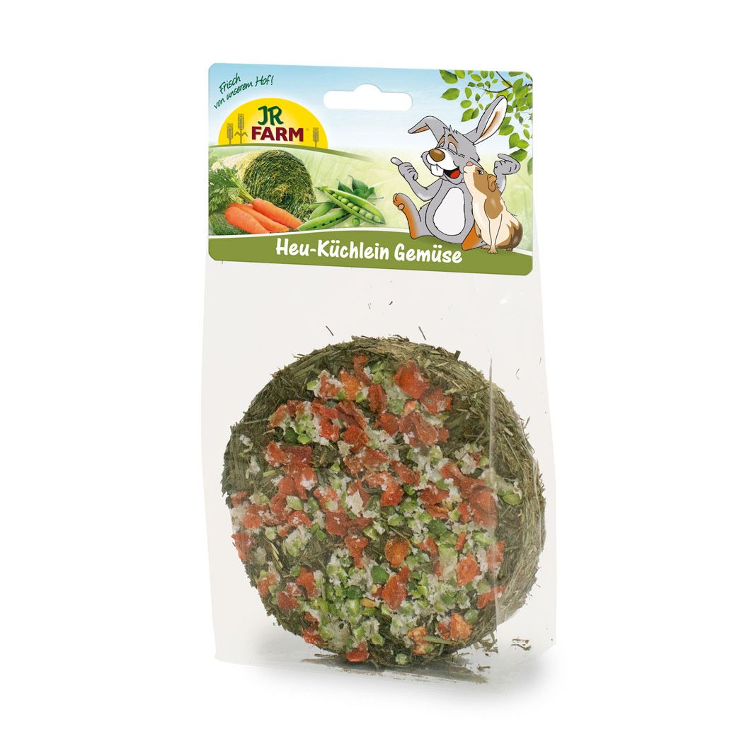 Das getreidefreie Heu-Küchlein bringt willkommene Abwechslung ins Nagerheim und ist für alle herbivoren Heimtiere ein Schmaus und eine Augenweide zugleich! Seine Basis besteht aus duftenden, getrockneten Kräutern und Heu aus eigenem Anbau. Verziert wird das Küchlein mit knackigen Karotten und Erbsen. Aus 100 % Naturmaterial gefertigt sind die Heu-Küchlein voll verzehrbar. Karotten und Erbsen dienen nicht nur als attraktiver Belag, sie versorgen die Tiere mit wertvollen Vitaminen und Nährstoffen und unterstützen die Verdauungsorgane. Schonend getrocknetes Bergwiesenheu ist die Basis für eine gesunde Ernährung von allen herbivoren Kleintieren. Der hohe Rohfaseranteil fördert außerdem den wichtigen Zahnabrieb bei Nagern und Zwergkaninchen. Das JR FARM Heu-Küchlein ist erhältlich in den Sorten Löwenzahn, Gemüse und Blüten.