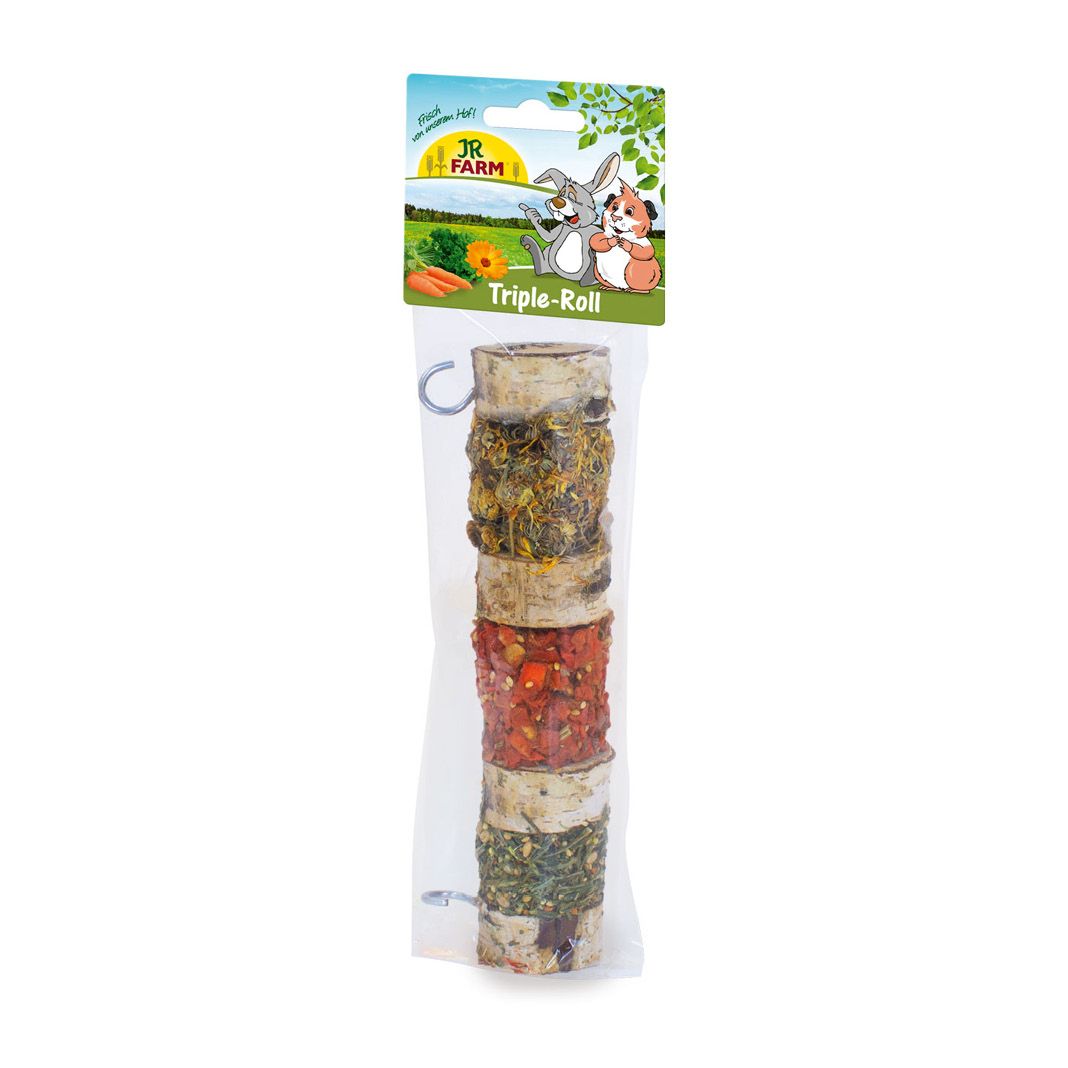 Die Triple-Roll aus 100 % Naturholz, wertvollen Saaten und drei aromatischen Füllungen bietet Nagern und Zwergkaninchen ausgiebigen Knabber-Genuss. Die unterschiedlichen Leckereien aus Petersilie, Karotten und Ringelblumenblüten vertreiben Langeweile im Nagerheim und fördern die Vitalität. Dieser abwechslungsreiche Knabberspaß versorgt Heimtiere mit einer Extra Portion Vitamin C und Beta Carotin aus Petersilie und Karotten und unterstützt die Harnwege und die Verdauungsorgane. Getrocknete Ringelblumenblüten duften unwiderstehlich und wirken zudem leicht entzündungshemmend. Das Knabbern und Nagen am Holz fördert außerdem den wichtigen Abrieb der lebenslang wachsenden Nagezähne. Die unbehandelte Triple-Roll eignet sich zum Komplettverzehr und lässt sich durch zwei praktische Haken an jeder beliebigen Stelle im Nagerheim befestigen.