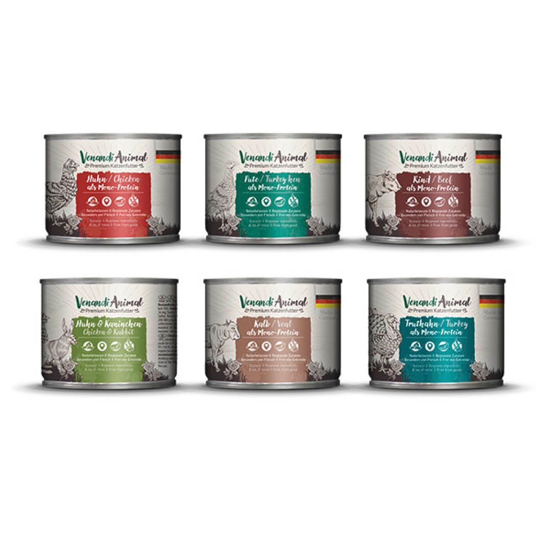 Venandi Nassfutter versorgt Ihre Katze mit allen wichtigen Nährstoffen und ist durch seine natürlichen und delikaten Zutaten äußerst schmackhaft. Der hohe Fleischanteil jedes Menüs stammt aus einer Proteinquelle, was selbst bei Katzen mit empfindlicher Verdauung zu einer sehr hohen Verträglichkeit führt. Neben frischem Muskelfleisch sind nahrhafte Innereien enthalten, die auf natürliche Weise den Bedarf an Vitaminen und Mineralstoffen decken.